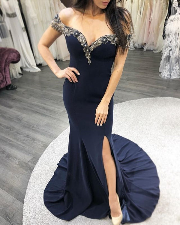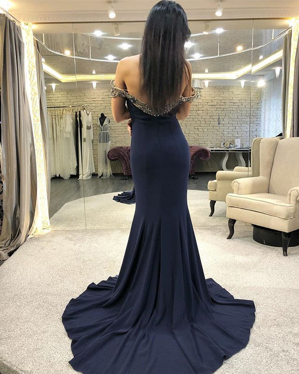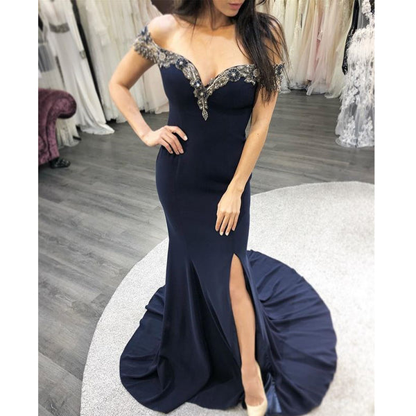 Off Shoulder Mermaid Jersey Sexy Slit Beaded Backless Prom Dresses, FC1964 Off Shoulder Mermaid Jersey Sexy Slit Beaded Backless Prom Dresses, FC1964