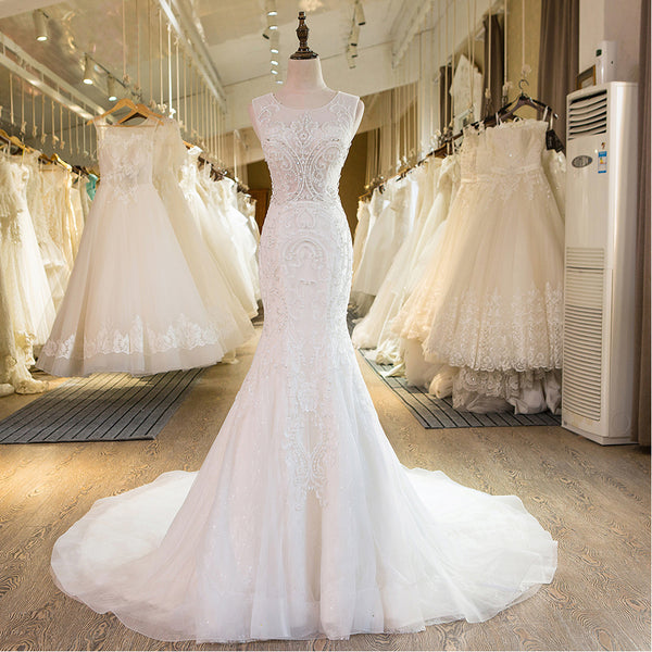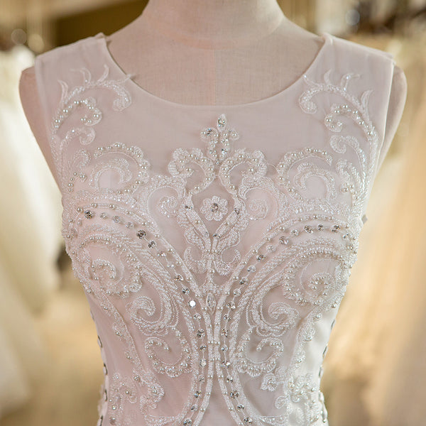Long Wedding Dress, Hot Sale Wedding Dress, Lace Bridal Dress, Sleeveless Wedding Dress, Beading Wedding Dress with Chapel Train, Tulle Wedding Dress, Applique Wedding Dress, LB0375