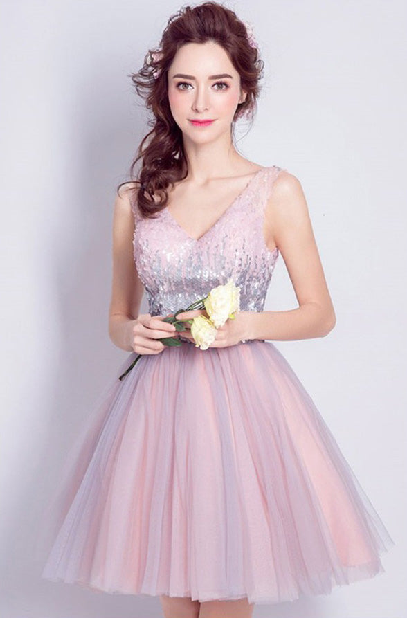 Short Homecoming Dress, Tulle Homecoming Dress, Sleeveless Homecoming Dress, Sequin Junior School Dress, V-Neck Graduation Dress, Backless Homecoming Dress, LB0505