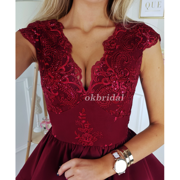 Lace V-Neck Homecoming Dress, Satin Knee-Length Cap Sleeve Sequin Homecoming Dress, KX53 Lace V-Neck Homecoming Dress, Satin Knee-Length Cap Sleeve Sequin Homecoming Dress, KX53