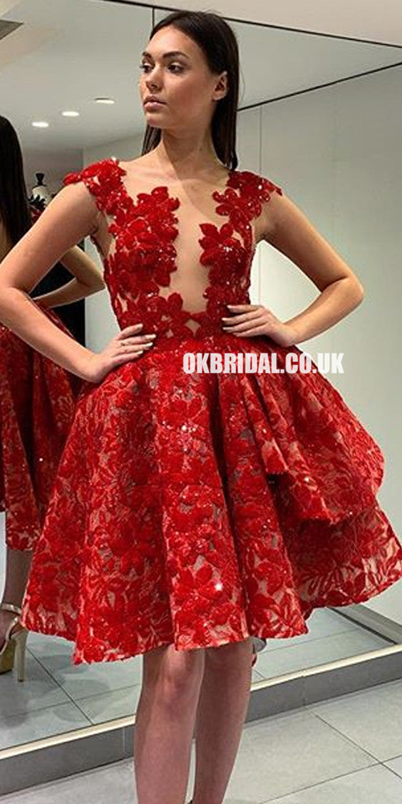 Red Lace High-Low Backless A-line Tulle Homecoming Dress, FC2228 Red Lace High-Low Backless A-line Tulle Homecoming Dress, FC2228